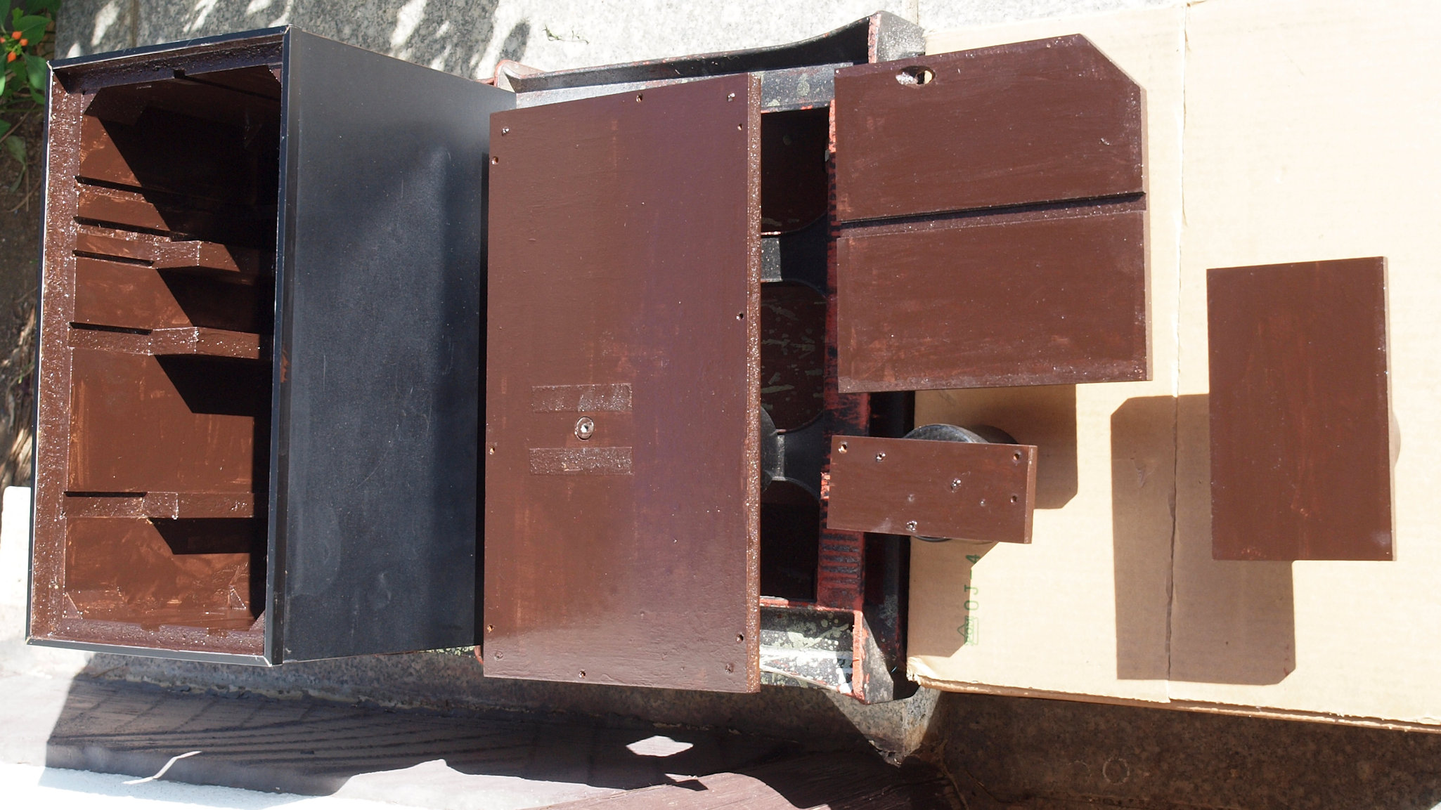 C49. 修理後 接着材が劣化した木箱、下後左から見る。 さらに、塗装する。