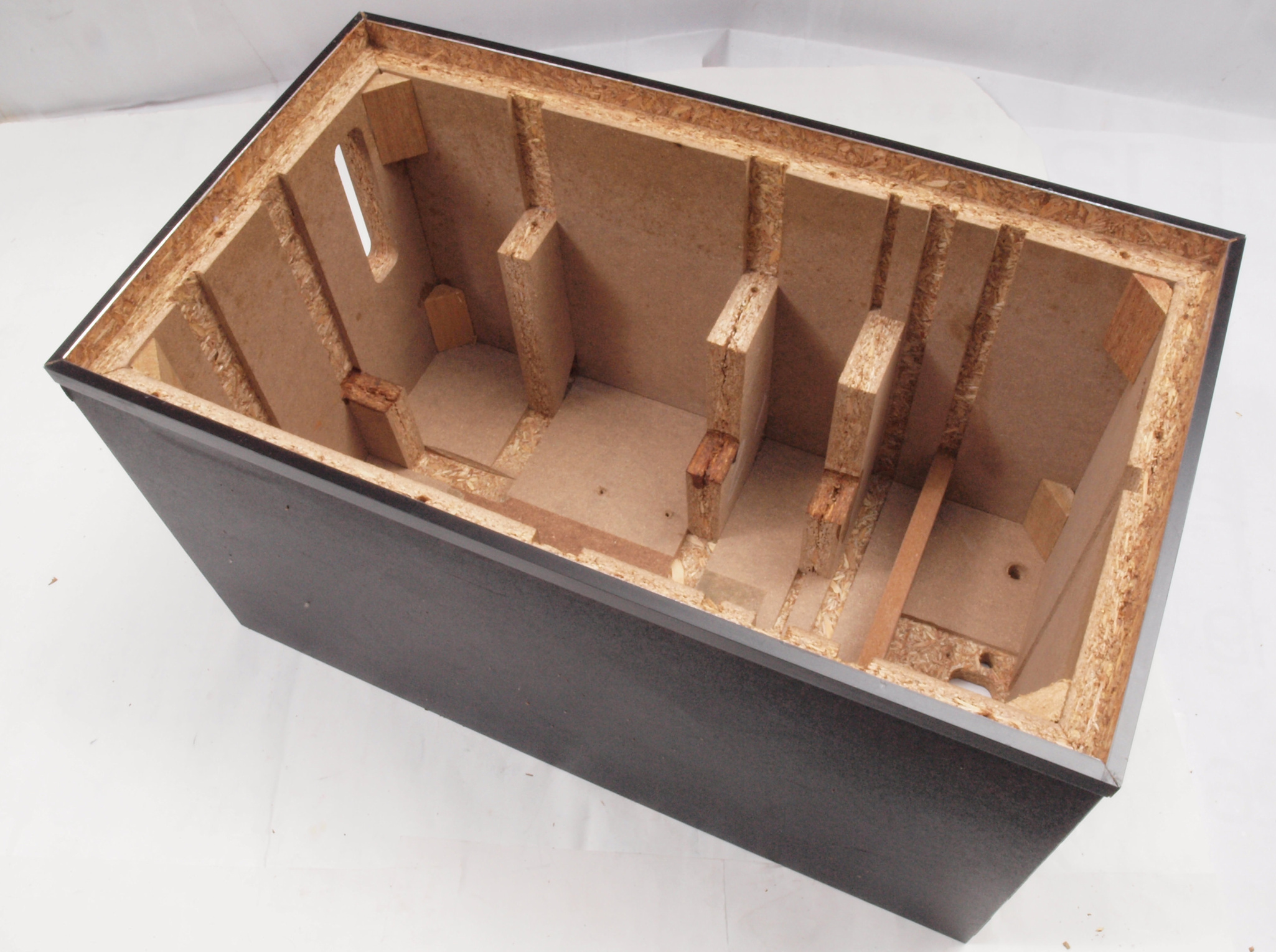 C48. 修理中 接着材が劣化した木箱、下後左から見る。圧縮板にボンドを塗って固めている。