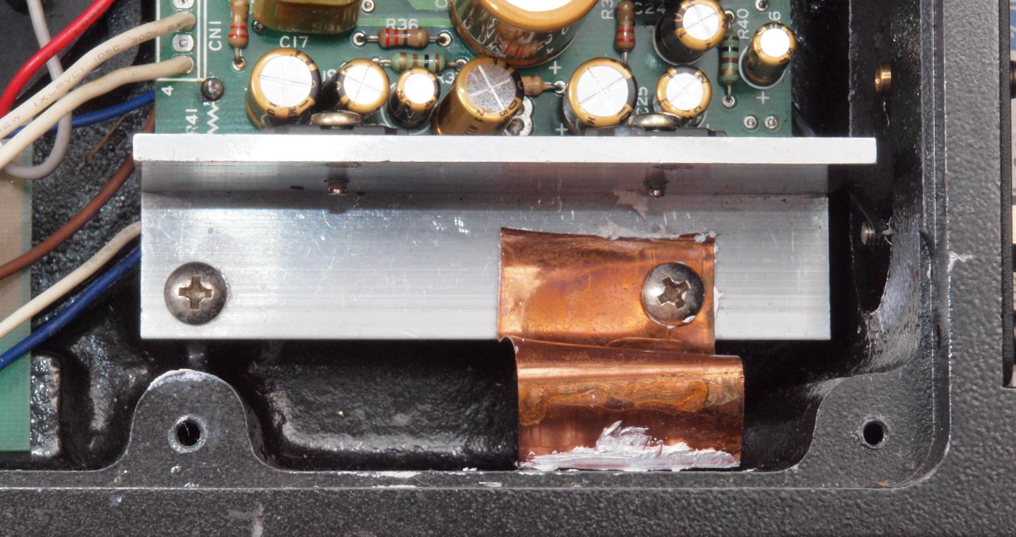 C92. 修理中 RY−5500U 下蓋を取り、下から見る。放熱器をケースに接触させる。