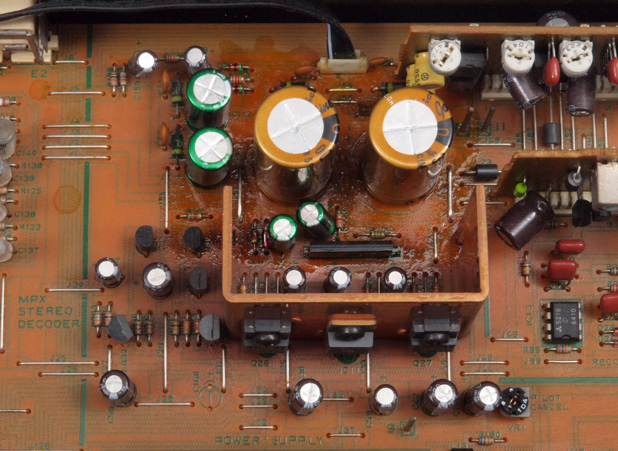 C12. 修理中 電源部。 電解コンデンサー固定するトルエン溶媒の接着剤。