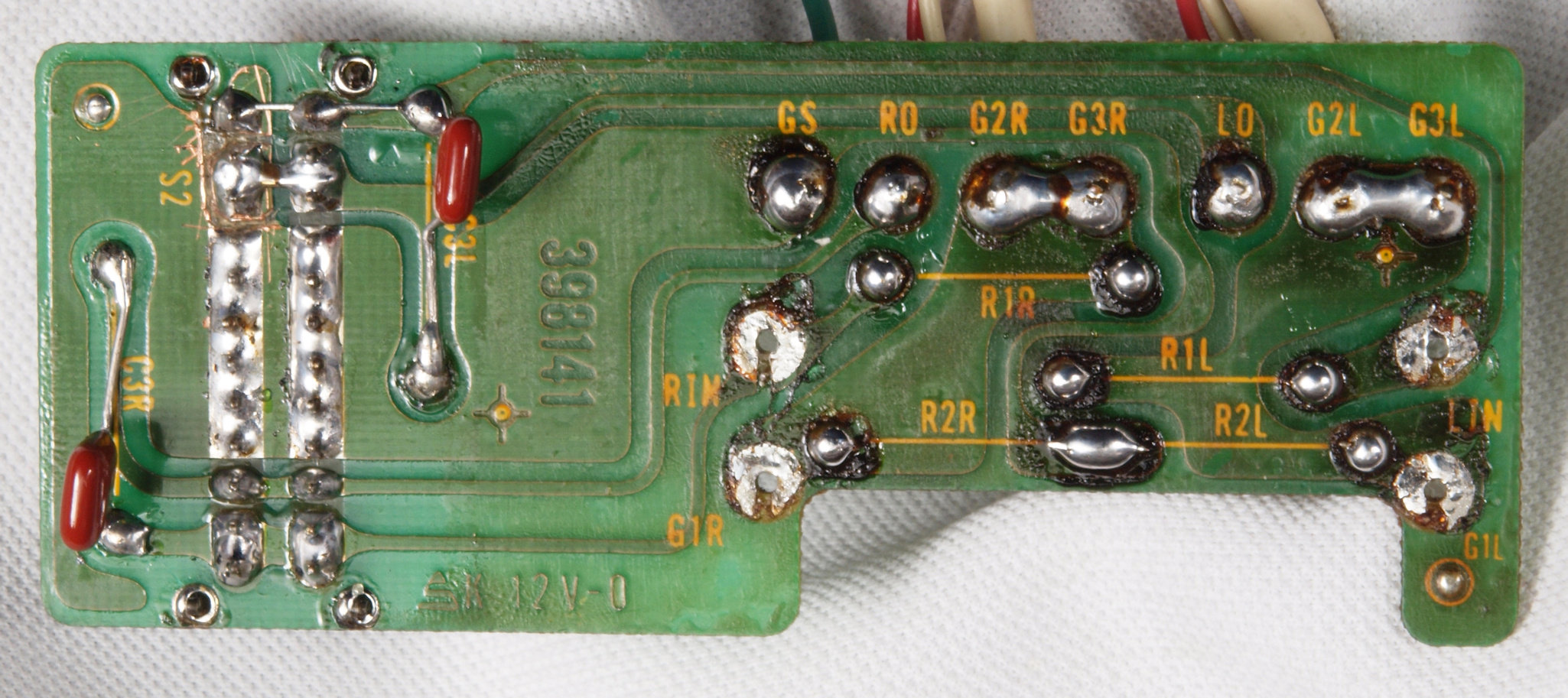 | CC5. 修理前 R側ドライブ基板−電源基板へのラッピング線。 |